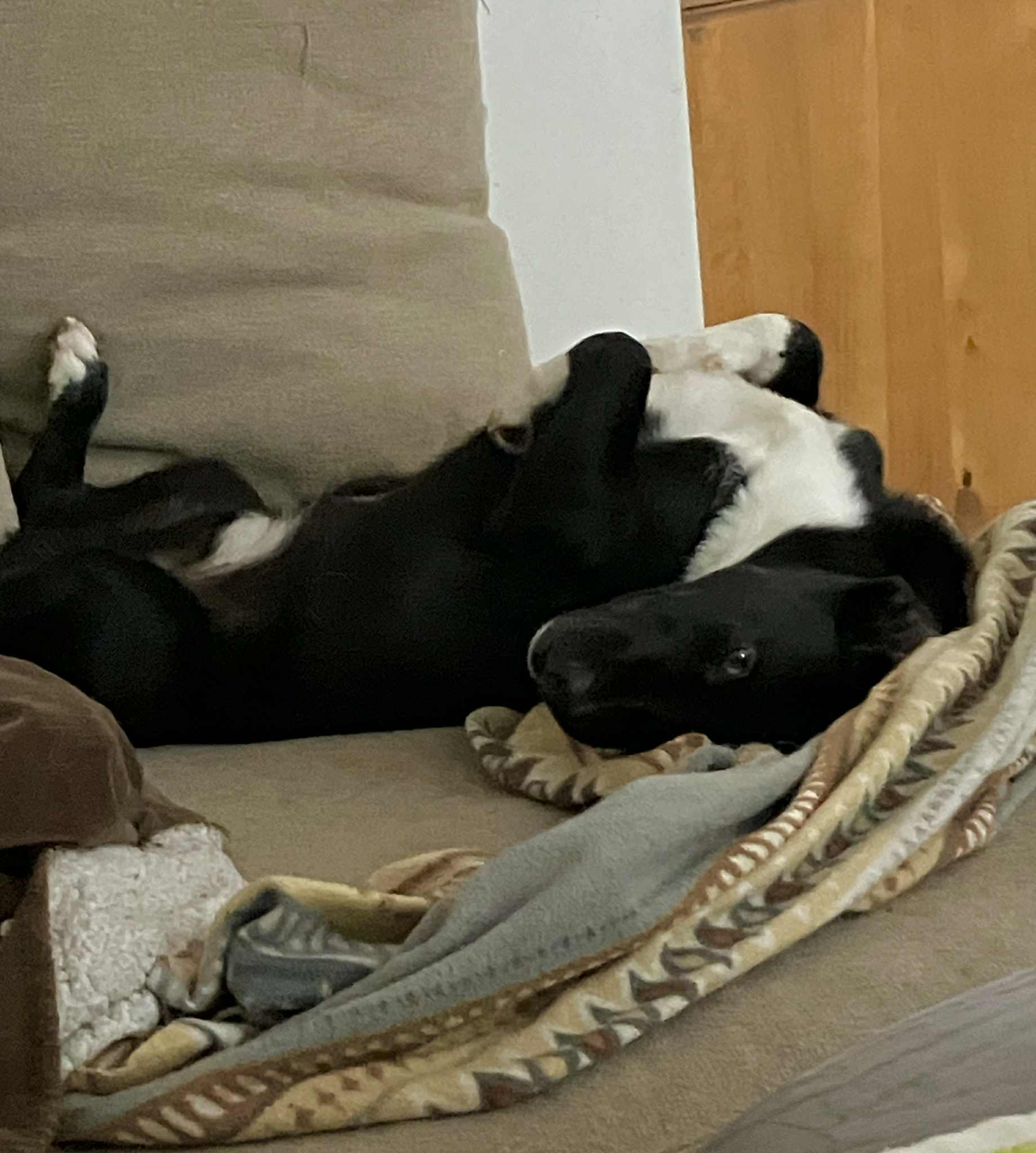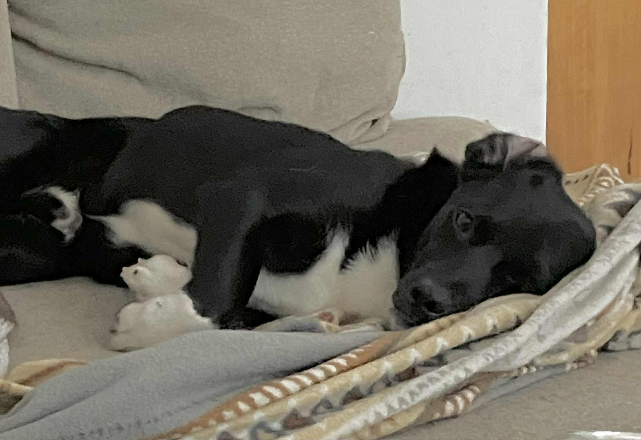 Med hundar är han duktig och han mår som bäst i deras sällskap och vi kommer därför prioritera att hitta ett hem där han får bo med en eller flera hundar. Han är tramsig och leker gärna med dom, men kan lika lätt slappna av och ta det lugnt sin sin bädd.